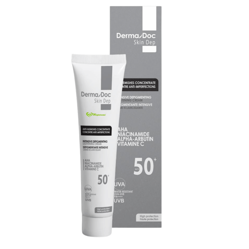 Crème Dépigmentante SPF50+ DERMADOC (40ml). Double action : traite les taches existantes et prévient l’apparition de nouvelles taches grâce à sa très haute protection solaire.