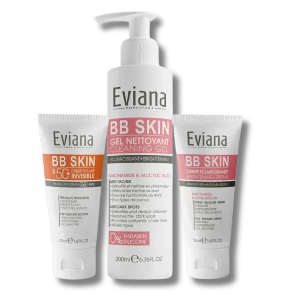 Le coffret Eviana BB Skin propose une routine en trois étapes, spécialement formulée pour les peaux grasses, sensibles et à tendance acnéique : Étape 1 : Gel Nettoyant Éclaircissant BB Skin (120ml) Nettoie en profondeur le visage et le corps, tout en respectant l’équilibre naturel de la peau. Étape 2 : Crème Éclaircissante Anti-Taches BB Skin (50ml) Formulée avec alpha-arbutine et niacinamide, cette crème éclaircit le teint et réduit les taches brunes pour une peau plus uniforme et lumineuse. Étape 3 : Crème Solaire Invisible SPF50 BB Skin (50ml) Protégez votre peau avec cette crème solaire invisible qui offre une haute protection UVA/UVB.